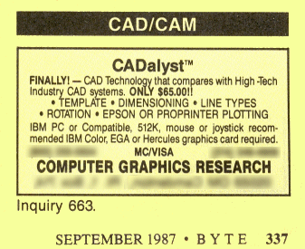 ![]() Photo of Tektronix 4002A courtesy Computer Museum, University of Amsterdam ![]() Advertisement in September 1987 issue of Byte Magazine ![]() CadStd running in DOS ![]() CadStd running in Microsoft Windows XP |